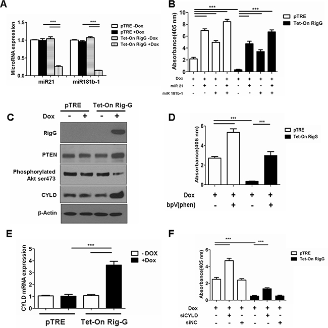 Figure 11: Rig-G inhibits NF-κB activation through downregulation of MiR21/PTEN/Akt and miR181b-1/CYLD pathways. A. The cells were respectively cultured in the presence or absence of Dox (2 μg/mL) for 24 h. Real-time PCR analysis of MicroRNA expression levels in A549 cell lines with and without Rig-G overexpression. The results are expressed as the mean ± SEM (n = 5), ***p < 0.001. B. NF-κB activation assay of A549 sublines pTRE and Tet-On Rig-G treated with miR-21 (100 nM), miR-181b-1 (100 nM) for 24 h. The results are expressed as the mean ± SEM (n = 3), ***p < 0.001. C. A549 sublines pTRE and Tet-On Rig-G were analyzed for the expression of the indicated proteins by immunoblot analysis. D. NF-κB activation assay of A549 sublines pTRE and Tet-On Rig-G treated with PTEN inhibitor bpV (phen) (10 μM ) for 24 h. The results are expressed as the mean ± SEM (n = 3), ***p < 0.001. E. Real-time PCR analysis of CYLD mRNA expression in A549 sublines pTRE and Tet-On Rig-G. The cells were respectively cultured in the presence or absence of Dox (2 μg/mL). The results are expressed as the mean ± SEM (n = 5), ***p < 0.001. F. NF-κB activity (ELISA assay) in A549 sublines pTRE and Tet-On Rig-G treated with siCYLD or siNC (negative control). The results are expressed as the mean ± SEM (n = 3), ***p < 0.001.