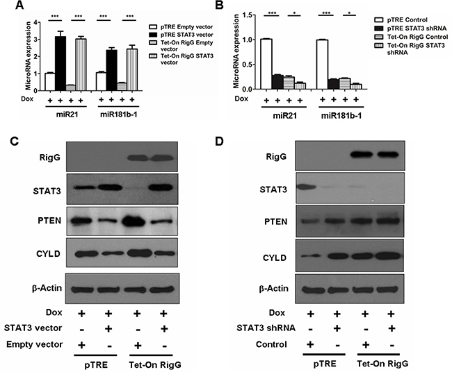 To further confirm the role of STAT3, we analyzed the expression of STAT3 targeting genes, miR21, miR181b-1, CYLD and PTEN, in Rig-G regulated STAT3 expression or knocked down A549 cells. In Rig-G overexpressing A549 cells, Rig-G expression resulted in a reduction in the induction of miR21 and miR181b-1 and an increase in the expression of CYLD and PTEN, which is blocked by the ectopic expression of STAT3 (Figure 12A, 12C). Silencing of STAT3 in pTRE A549 cells significantly reduced the expression of miR21 (Figure 12B). In Rig-G overexpressing A549 cells, knockdown of STAT3 exhibited a lower miR21 level than control (Figure 12B). Similar results were seen in the expression of miR181b-1 (Figure 12B). Expression of CYLD and PTEN were induced in response to STAT3 knockdown or Rig-G overexpression, and both proteins has a modest increase in STAT3 knockdown A549 cells with Rig-G overexpression (Figure 12D). These results are consistent with those obtained by measuring miR21 and miR181b-1.