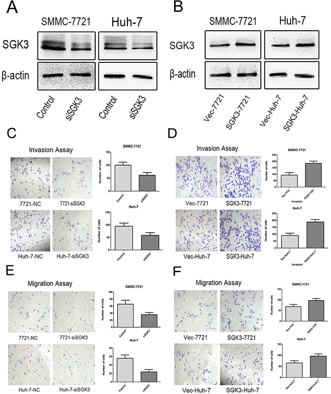 Figure 2: SGK3 promotes cell migration and invasive potential. A. Depletion of SGK3 in SMMC-7721 and Huh-7 cells. Cells were transfected with siRNAs against AGK3 and controls, and then subjected to Western blotting with an anti-SGK3 antibody. β-actin was used as loading control. B. Overexpression of SGK3 in SMMC-7721 and Huh-7 cells. Cells were transfected with empty vector or a vector expressing SGK3, and then subjected to Western blot analysis with an anti-SGK3 antibody. β-actin was used as loading control. C. Control and SGK3-depleted SMMC-7721 and Huh-7 cells were subjected to a transwell Matrigel invasion assays D. Empty vector and SGK3-overexpressing SMMC-7721 and Huh-7 cells were subjected to a transwell Matrigel invasion assays E. Control and SGK3-depleted SMMC-7721 and Huh-7 cells were subjected to a transwell migration assays F. Empty vector and SGK3-overexpressing SMMC-7721 and Huh-7 cells were subjected to transwell migration assays. All experiments were performed in triplicate, and the results are shown as the mean ± standard deviation.