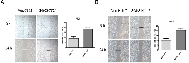 Figure 3: Overexpression of SGK3 promotes wound-healing capacity of HCC cells. A. A wound-healing assay was performed to determine the migratory capacity of SMMC-7721 cells transfected with empty vector or SGK3-overexpressing lentiviral vector. B. A wound-healing assay was performed to determine the migratory capacity of Huh-7 cells transfected with empty vector or SGK3-overexpressing lentiviral vector. All experiments were performed in triplicate, and the results are shown as the mean ± standard deviation.