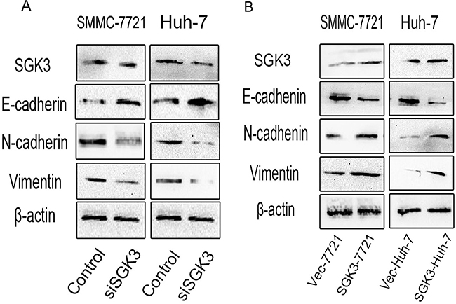 Figure 4: SGK3 regulates the expression of epithelial and mesenchymal markers. A. Depletion of SGK3 resulted in a gain of E-cadherin expression and a loss of N-cadherin and Vimentin expression in SMMC-7721 and Huh-7 cells. B. Overexpression of SGK3 resulted in a loss of E-cadherin expression and a gain of N-cadherin and Vimentin expression in SMMC-7721 and Huh-7 cells. The expression of E-cadherin, N-cadherin and Vimentin was detected by Western blot analysis. β-actin was used as loading control. All experiments were performed in triplicate.