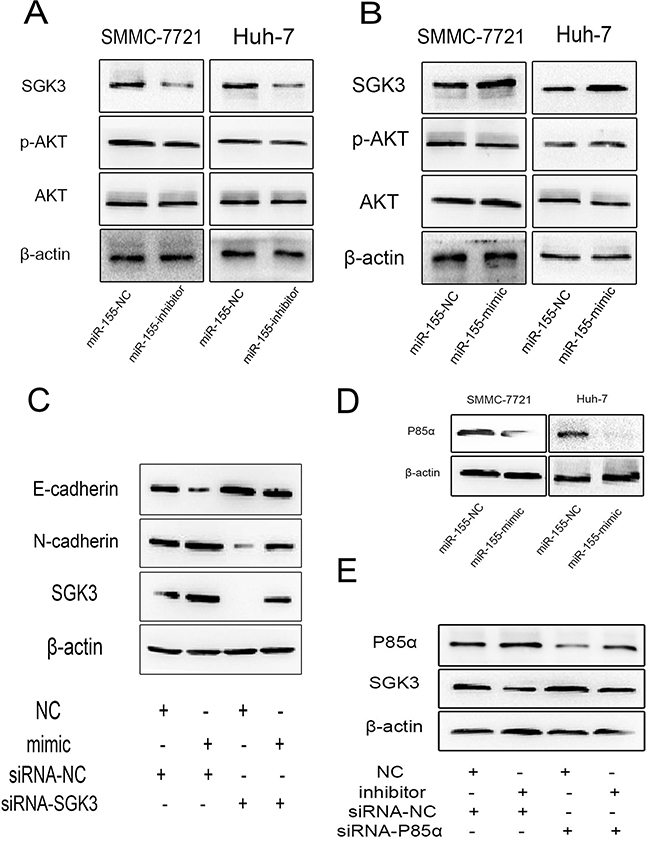 Figure 5: miR-155 stimulates EMT through by targeting P85α to activate SGK3. The expression of SGK3, p-AKT, AKT in SMMC-7721 and Huh-7 cells A. treated with miR-155 inhibitors or B. overexpressing miR-155 was measured by Western blot analysis. β-actin was used as a loading control. All experiments were performed in triplicate. C. The suppression of SGK3 in SMMC-7721 cells transiently overexpressing miR-155 resulted in a rescue of EMT inhibition detected by western blot. D. Western blot shows decreased expression of endogenous P85α due to miR-155 overexpression in SMMC-7721 and Huh-7 cells. E. The suppression of P85α in SMMC-7721 cells with transiently repressed miR-155 resulted in a rescue of SGK3 suppression detected by western blot.