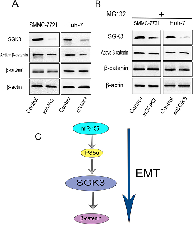 Figure 6: SGK3 regulates β-catenin signaling in HCC cells. A. The expression of SGK3, active β-catenin and total β-catenin were detected by Western blot analysis in SMMC-7721 and Huh-7 cells with SGK3 knocked down. β-actin was used as a loading control. B. Use of the proteasome inhibitor MG132 (10 μM; 8 hours) prevented the degradation of β-catenin induced by SGK3 depletion. All experiments were performed in triplicate. C. Schematic illustration of SGK3 promotion of EMT. miR-155 stimulates the expression of SGK3 to promote β-catenin signaling in HCC cells.