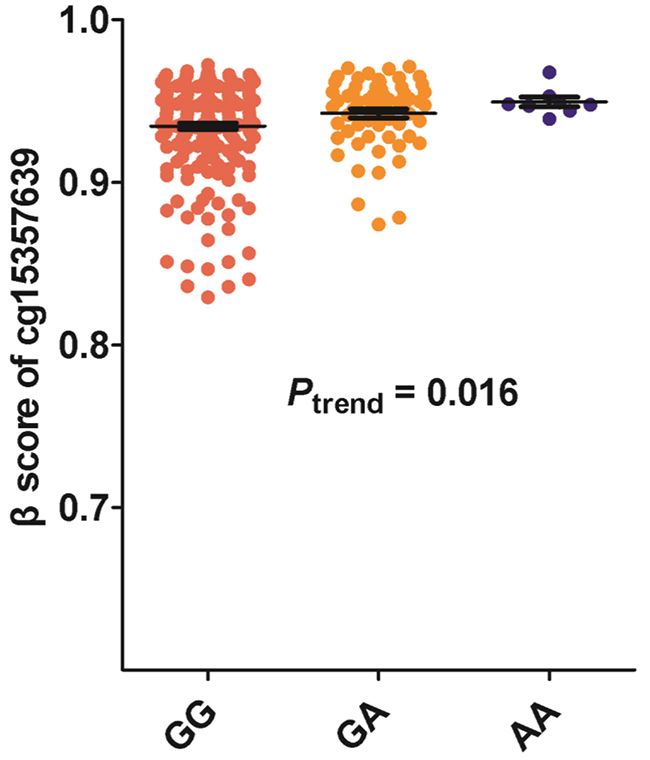 Figure 2: Association between rs125701 polymorphism and the methylation level of CpG site of cg15357639. There was prominent trend of increased methylation activity of CpG site of cg15357639 among the three genotype groups (Ptrend = 0.016).