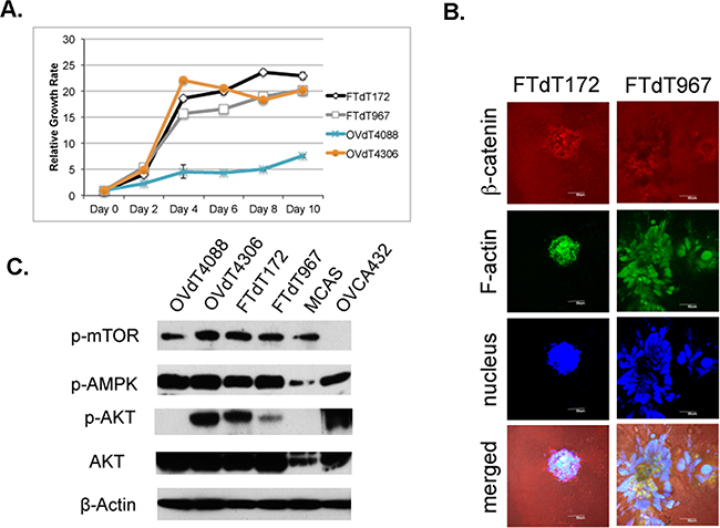 As HGSOC is a highly aggressive tumor, we compared the growth rate among the mouse tumor cell lines (Figure 2A). Both Dicer-Pten DKO cancer cell lines and the OVdT4306 cancer line showed enhanced growth rate compared with the K-rasG12D/+ TP53-/- OVdT4088 mouse cancer cell line. We also tested the two Dicer-Pten DKO cancer cell lines in a sequential three-dimensional culture system which we have previously developed [29]. The FTdT967 line showed more aggressive growth and invaded into the collagen I extracellular matrix after 3 days of growth (Figure 2B), suggesting that this line is derived from a tumor that may have a more aggressive phenotype. Both Dicer-Pten DKO tumor lines and the OVdT4306 cancer cell line shared genomic Pten deletion, which affected the PI3K/AKT key metabolic and cell growth pathway. We investigated the status of AKT pathway in different cancer cell lines by Western blot analysis (Figure 2C). These three mouse cancer cell lines showed increased phospho-AKT expression when compared with the OVdT4088 line, and expectedly, showed stronger expression of the downstream phospho-mTOR target. However, within these four mouse cell lines, there was no change in phospho-AMPK, another master regulator of cell growth and metabolism that can affect mTOR activity [31].
