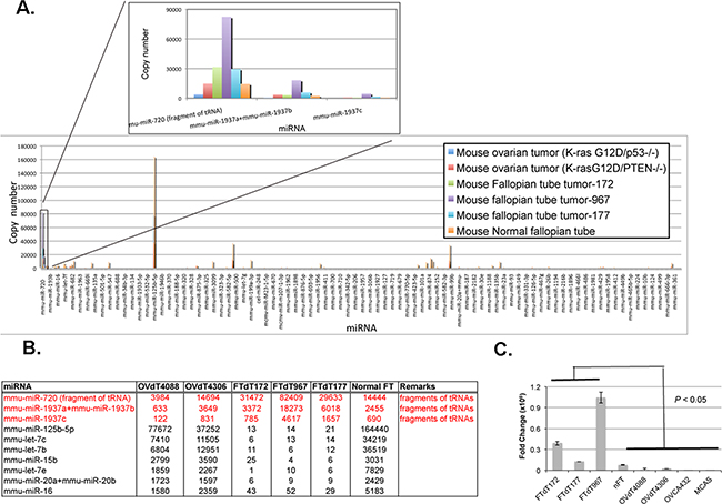 Figure 3: The Dicer-Pten DKO mouse cancer cells expressed elevated levels of tRNA fragments. A. The result of the Nanostring® nCounter miRNA expression assay. The relative expression of mmu-miR-720, mmu-miR-1937a, 1937b, and 1937c in different cell lines is shown in the inset. B. Normalized counts of the miRNAs representing tRNA fragments that are elevated (red), as well as some other miRNAs that are significantly down-regulated (dark) in the Dicer-Pten DKO mouse cancer cells relative to normal fallopian tube (FT) and ovary-derived tumor cell lines. C. qRT-PCR of mmu-miR-720 in different RNA preparations.