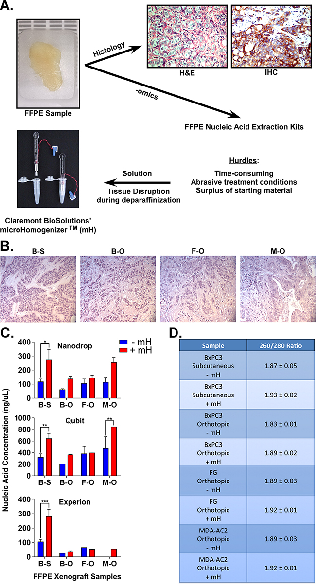 Figure 1: A. FFPE samples are usually used for hematoxylin and eosin (H&E) and/or immunohistochemistry (IHC) stains. To overcome hurdles associated with gene expression analyses of tissue in FFPE samples, we show that the mH can increase the purification of high-quality RNA for downstream applications. B. H&E staining of the four xenograft FFPE samples (BxPC3 [B] and FG [F]) or patient (MDA-AC2 [M]) xenografts (S = subcutaneous, O = orthotopic). C. Nucleic acid (RNA) concentrations (ng/uL) for the four FFPE samples of PDAC using either the standard Qiagen FFPE RNA extraction (-mH) or our mH-modified protocol (+mH). Measurements were made using Nanodrop, Qubit and Experion Bioanalyzer assays. D. Average +/- standard error mean (SEM) RNA 260/280 ratios for the same samples described in (A). *, **, *** indicate student t-test p values < 0.05, 0.01 and 0.001, respectively.
