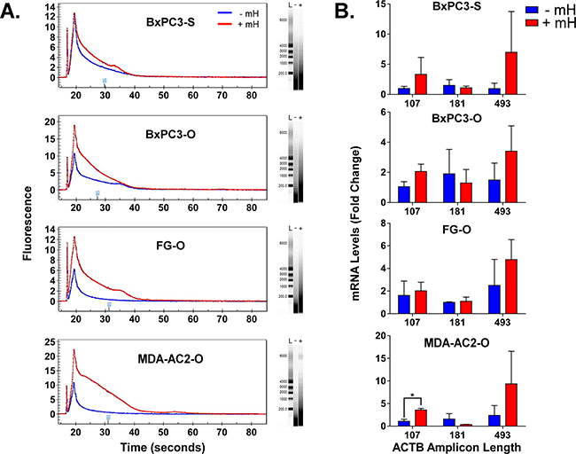 Figure 2: A. Overlay of representative Experion-generated electropherograms and gels for total extracted FFPE RNA from either the -mH or +mH RNA extraction methods. L, - and + in the gels indicates lanes for the ladder, -mH and +mH sample preparation methods. B. RNA extracted from FFPE tumor samples using these two methods was reverse transcribed to cDNA and analyzed by qPCR in triplicate using βactin-specific primers that generate increasing length amplicons. βactin Ct values were normalized relative to the HPRT1 and POLR2A house-keeping genes and plotted as relative quantification (RQ) fold change compared to the FFPE samples processed without the mH-based method. * indicates a Student’s t-test p value < 0.05.