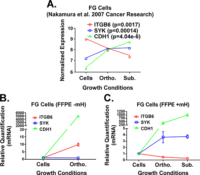 Figure 3: A. Previously published expression patterns for ITGB6, SYK and CDH1 genes (Nakamura et al.) in FG cells grown under 2D in vitro, subcutaneous in vivo and orthotopic in vivo microenvironment conditions. RNA was processed from fresh/frozen samples. B and C. qPCR analysis for these same three genes in RNA extracts from FG cells grown in vitro or FFPE samples of FG cell xenografts. RNA was isolated using the standard Qiagen FFPE RNA kit protocol (B) or our mH-modified protocol (C). Relative quantification (RQ) values for gene expression were normalized to house-keeping genes (GAPDH and/or POLR2A) and calculated relative to gene expression levels in cells grown in vitro.