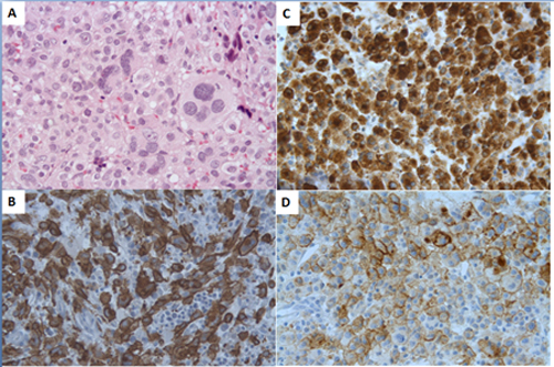 These highly atypical MCs are often misdiagnosed with multiple differential diagnoses, including carcinoma metastasis, diffuse large B-cell lymphoma or anaplastic large B-cell lymphoma (ALCL).