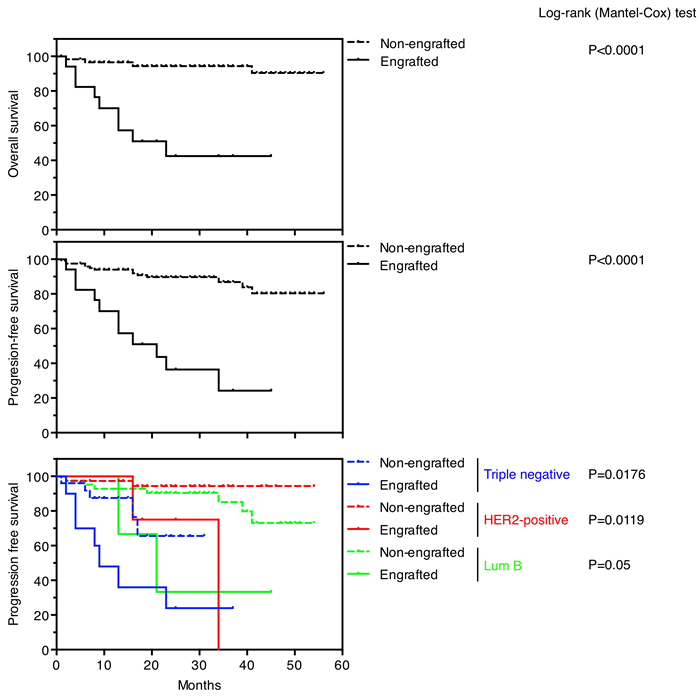 Successful engraftment was indicator of reduced overall survival and progression free survival (p < 0.0001) (Figure 1). Sixteen patients (11.8%) died from breast cancer, of which 9 (56.3%) were successfully engrafted. One hundred and eight patients (78,8%) remained with no evidence of disease, of which 102 (94.4%) failed to generate a PDX. The statistically significant bad prognosis of tumors that successfully engrafted was consistent in three subtypes of tumors analyzed (triple negative, HER2-positive and luminal B) (Figure 1). Thus, in agreement with previous reports [4,6], our collection of breast cancer PDXs is enriched in aggressive tumors of poor prognosis, making it a useful tool to characterize therapies against the most deadly tumors.