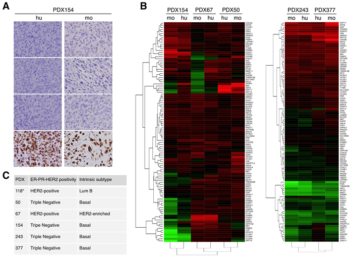 Figure 2: Characterization of different breast cancer PDXs. A. The expression of the estrogen receptor (ER), progesterone receptor (PR), human epidermal growth factor receptor 2 (HER2) and Ki-67 were evaluated in samples from the indicated patient (hu, human) and the corresponding PDX (mo, mouse). B. Unsupervised hierarchical clustering of the samples from the original tumor (hu) or samples from the corresponding PDXs (mo) according to the levels of expression of 110 selected genes analyzed using the Counter platform. All tumors were assigned to an intrinsic molecular type of breast cancer (Luminal A, Luminal B, HER2-enriched, and Basal-like) [26]. The analyses of PDXs 154, 67 and 50 and PDXs 243 and 377 are presented separately because they were performed in different experiments. C. Results of analyses performed as in A and B on the indicated PDXs. Note that the characterization of PDX118 has been published elsewhere [16].