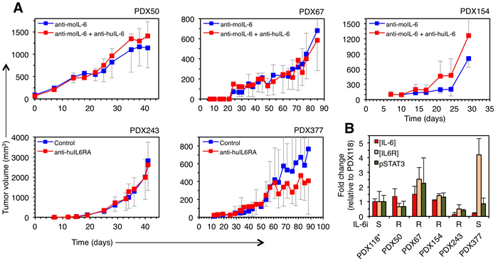 Analysis of the levels of IL-6 and IL6RA showed no significant differences between the sensitive and insensitive PDXs (Figure 3B), indicating that the levels of expression of these components do not correlate with sensitivity to anti-IL-6 therapy. Further, the basal levels of phospho-STAT3, the active form of one of the main intracellular signals transduced by IL-6 and other cytokines [17], did not correlate with responsiveness to anti-IL-6 or anti-IL-6RA blocking antibodies (Figure 3). Thus, the efficacy of anti-IL-6 therapy cannot be predicted by analyzing the absolute levels of the cytokine, its cognate receptor or one of its signal transducers.