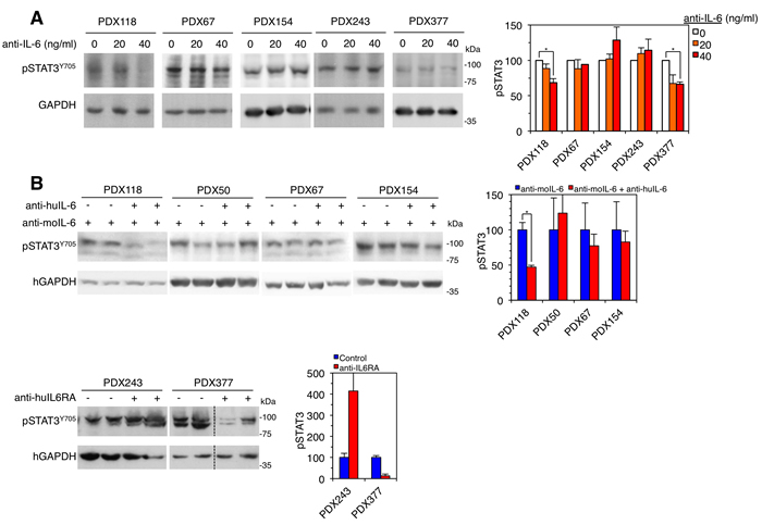 Figure 4: Effect of anti-IL-6 on the levels of phospho-STAT3. A. Left, cell cultures established from the indicated PDXs were treated with different concentrations of anti-IL-6. Then, cells were lysed and the cell lysates were analyzed by Western blot with the indicated antibodies. Right, results from four independent experiments were quantified and expressed as averages ± SD. * P < 0.05 by the Student’s t test. B. Left, samples from the indicated PDXs treated as shown in Figure 3 were lysed and analyzed by Western blot with the indicated antibodies. Right, results were quantified and expressed as averages ± SD. * P < 0.05 by the Student’s t test.