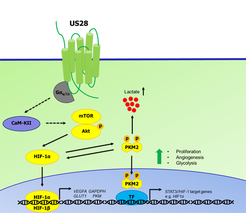 In this study we demonstrate that the HCMV-encoded chemokine receptor US28 stimulates the HIF-1/PKM2 feedforward loop, resulting in increased cell proliferation, VEGF secretion and glycolysis in fibroblasts and glioblastoma cells. Also in HCMV-infected cells, US28 mediates increased HIF-1α activity. These observations further confirm the oncomodulatory role of US28, which through HIF-1α and PKM2 drives cell proliferation, angiogenic processes and metabolic reprogramming.