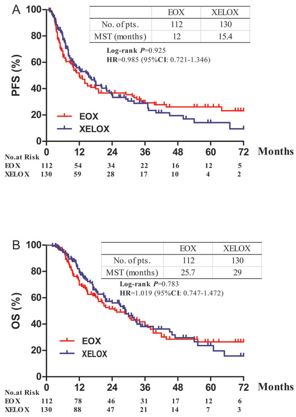 After a median follow-up of 17.4 months (range 2.2-83.2 months), 163 patients (77 in group A and 86 in group B) had disease progression or relapsed, 106 patients (69 in group A and 67 in group B) died. The median OS was 25.7 months (95% CI 17.2-34.1) in group A and 29.0 months (95% CI 22.1-35.8) in group B (HR 1.019; 95%CI 0.747-1.472, P = 0.783). The median PFS was 12.0 months (95% CI 8.7-15.2) and 15.4 months (95% CI 10.2-20.5) for group A and B, respectively (HR 0.985; 95% CI 0.721-1.326, P = 0.925, Figure 1).