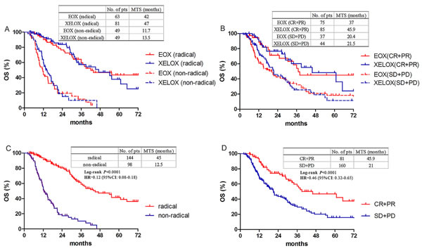 Subgroup analysis showed no statistical benefit favored any regimen in any variables (Figure 2). Patients who underwent a radical resection had similar overall survival between two groups, as well as those who had tumor response (Figure 3A and 3B). Patients who had undergone a radical resection had a significant longer median OS of 45 months (95% CI 32.4-57.4 months) than patients without radical resection (12.5months, 95% CI 9.9-15.0 months, HR 0.12; 95%CI 0.08-0.18, P < 0.0001, Figure 3C). Resection followed response to chemotherapy, and tumor response itself had a major influence on the OS (HR 0.46; 95%CI 0.32-0.65, P < 0.0001, Figure 3D).