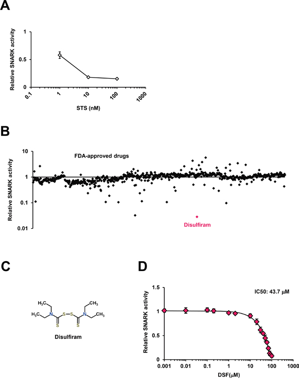 Figure 1: The SNARK kinase inhibitor screen in vitro. A. The in vitro SNARK kinase assay system was validated using the known multi-kinase inhibitor STS as the control. B. The kinase assay was performed for 636 compounds in the FDA-Approved Drug Screen-well Library. Z scores of relative kinase activities in the presence of individual drugs compared with DMSO controls are indicated. C. The chemical structure of DSF retrieved from the database ChemSpider. D. The kinase inhibitory effects of DSF were examined at 0.001, 0.01, 0.1, 0.2, 1, 2, 10, 20, 30, 40, 50, 60, 70, 80, 90, and 100 μM in vitro.