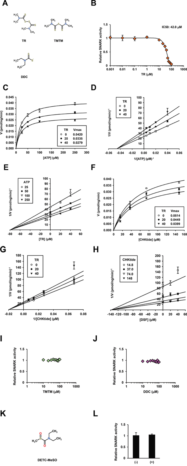 Figure 3: DSF analogs and enzymatic kinetics of SNARK kinase inhibition by TR. A. Chemical structures of TR, TMTM, and DDC were retrieved from ChemSpider. B. Similarly to Figure 1D, the kinase inhibitory effects of TR were examined at 0.001, 0.01, 0.1, 1, 10, 20, 30, 40, 50, 60, 70, 80, 90, and 100 μM in vitro. Similarly to Figure 2, the in vitro SNARK kinase assay was performed with 25, 50, 100, and 250 μM ATP or 14.8, 37.0, 74.0, and 148 μM CHKtide in the presence of 0, 20, and 40 μM TR. Subsequently effects of TR on enzymatic kinetics of SNARK were calculated, yielding Michaelis-Menten plots. C. and F. Lineweaver-Burk plots D. and G. and Dixon plots E. and H. Similarly to (B), effects of TMTM and DDC, and DETC-MeSO K. on SNARK kinase activity were examined at 10, 20, 30, 40, 50, 60, 70, 80, 90, and 100 μM I. and J. and 100 μM L. respectively.