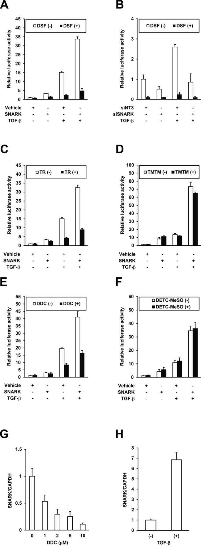 Figure 4: Inhibition of SNARK-promoted TGF-β signaling by DSF. A. HepG2 cells were transfected with PAI/L and pRL-TK in combination with pEBMulti-Puro (Vehicle) or pEBMP-SNARK-3×FL (SNARK), followed by the treatment with DSF at 15 μM and TGF-β at 10 ng/mL 24 h later. On the next day the cells were lysed and the firefly and Renilla luciferase activities were measured. B. HepG2 cells were transfected with non-targeting siRNAs (siNT3) or siRNAs to SNARK (siSNARK), followed by transfection with PAI/L and pRL-TK 24h later. On the next day DSF at 10 μM and TGF-β at 10 ng/mL were added and 24h later the cells were lysed and the firefly and Renilla luciferase activities were measured. Similarly to (A), the assays were performed using TR C. TMTM D. DDC. E. and DETC-MeSO F. in place of DSF. Total RNA was extracted from HepG2 cells treated with DDC at indicated concentrations G. or 10 ng/mL TGF-β H. for 48h and SNARK mRNA levels were quantified by qRT-PCR with normalization to GAPDH. n ≥ 3. Error bars = SD.