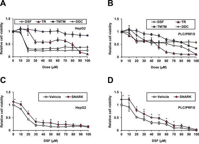 Figure 5: Inhibition of SNARK-promoted HCC cell proliferation by DSF. HepG2 A. and PLC/PRF/5 B. cells were treated with DSF, TR, TMTM, and DDC at the indicated doses for 24 hours and the relative cell viabilities to untreated control cells were measured by CCK-8 assay. pEBMulti-Puro (Vehicle) or pEBMP-SNARK-3×FL (SNARK) was transfected into HepG2 C. or PLC/PRF/5 D. cells, followed by DSF treatment at the indicated concentrations 48h later. On the next day the relative cell viabilities to the control samples untreated and transfected with pEBMulti-Puro were measured similarly to (A) and (B). *P < 0.05 by Student’s t-test. n = 4. Error bars = SD.