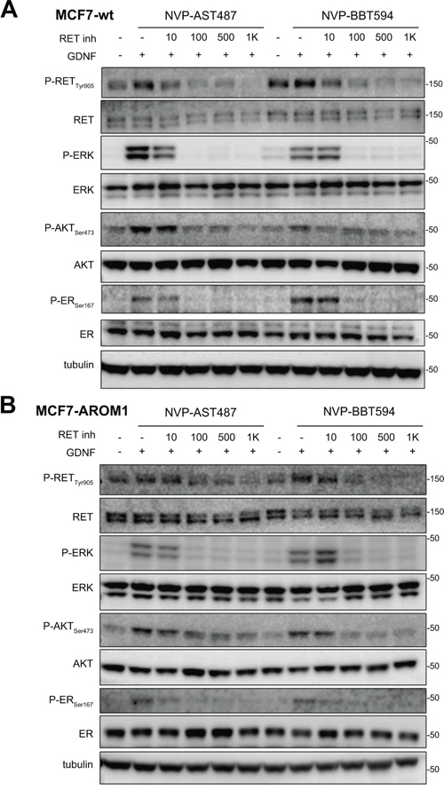 Figure 2: NVP-BBT594 and NVP-AST487 have comparable inhibitory effects on RET downstream signaling in both wild-type and aromatase-expressing (AROM1) MCF7 cells. A. Wild-type MCF7 cells were serum-starved for 24 hours before pre-treating with NVP-AST487 or NVP-BBT594 for 90 minutes before GDNF (20 ng/ml) stimulation for 30 minutes. For the experiments performed in the absence of E2, wild-type MCF7 cells were 3 day E2 deprived in DCC medium before serum starvation. B. MCF7-AROM1 cells were E2 deprived for 3 days in DCC medium and stimulated with androstenedione (10 mM) for the last 24 hours. The cells were then serum-starved for a further 24 hours and pre-treated with the indicated concentrations of NVP-AST487 or NVP-BBT594 for 90 minutes before GDNF (20 ng/ml) stimulation for 30 minutes. Total cell lysates were subjected to western blotting using the indicated antibodies. Tubulin was used as a loading control. Molecular size markers are in kDa.