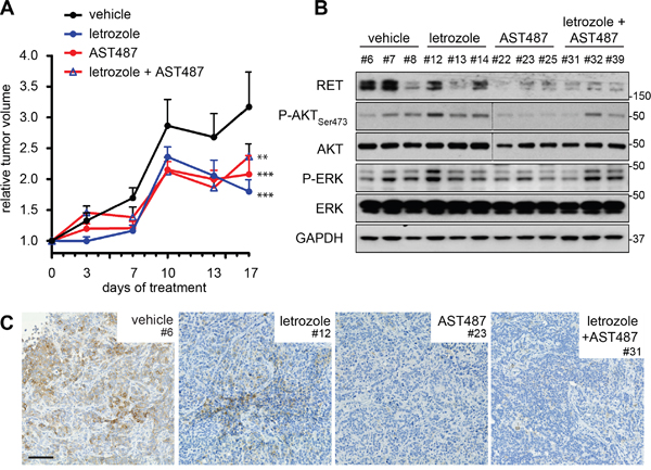 Figure 4: Combination treatment of NVP-AST487 and letrozole is not superior to monotherapies in reducing primary tumor growth. Ovariectomized mice under androstenedione support were inoculated with MCF7-AROM1 cells. Following randomization, mice were treated daily with vehicle, letrozole, NVP-AST487 or letrozole plus NVP-AST487 as described in the Methods (n = 10 mice per group). A. Tumor volumes show as fold change relative to day 1 of treatment +SEM (2-way ANOVA, Tukey’s corrected; **, P<0.01, ***, P<0.001). At the end of the experiment, tumors were halved for B. extraction of total lysates (n = 3 tumors per treatment group) for western blotting as indicated. GAPDH was used as a loading control. Molecular size markers are in kDa. Dotted line indicate two separate gels, run in parallel and exposed for equal lengths of time and C. RET immunohistochemistry. Representative images are shown. Scale bar, 200 μm.