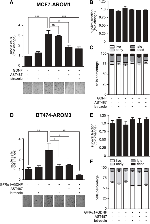 Figure 5: NVP-AST487, but not letrozole, reduces GDNF-induced MCF7-AROM1 cell motility. MCF7-AROM1 (A-C) and BT474-AROM3 (D-F) cells deprived of E2 for 3 days in DCC medium were stimulated with androstenedione (10 nM) in the presence or absence of letrozole (100 nM), GFRα1 (100 ng/ml), GDNF (20 ng/ml) and/or NVP-AST487 (100 nM). (A, D) Cell motility in Transwells was measured after 48 hours. One-way ANOVA, Bonferroni’s corrected, **, P<0.01, ***, P<0.001. Representative images of DiffQuick strained Transwell filters are shown. 4X magnification. (B, E) Cell viability was measured after 48 hours. Data represent mean +SEM, n=3 independent experiments. One-way ANOVA, Bonferroni’s corrected, ns: not significant. (C, F) Apoptosis was measured using the PI/AnnexinV assay. Bar graphs show mean percentage +SEM of cells that are alive, undergoing early or late apoptosis and cells that are dead. One-way ANOVA revealed no significant differences between the groups.