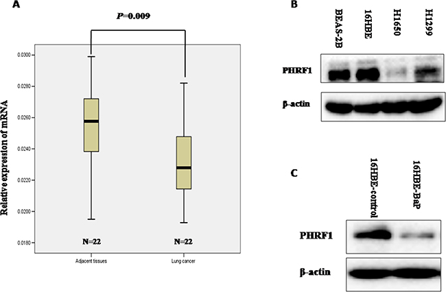 Figure 1: The relative level of PHRF1 mRNA expression in human lung tissues was detected by qRT-PCR and the expression of PHRF1 in lung cancer cell lines and malignant 16HBE cells induced by BaP was detected by western blot. The lower level of PHRF1 mRNA expression was observed in human lung cancer tissues than that in paracancerous tissues A. The decreased expression of PHRF1 protein was observed in lung cancer cell lines (H1299 and H1650) than that in normal human bronchial epithelial cell lines (16HBE and BEAS-2B) B. The decreased expression of PHRF1 protein was observed in malignant 16HBE cells induced by BaP than that in control cells C.