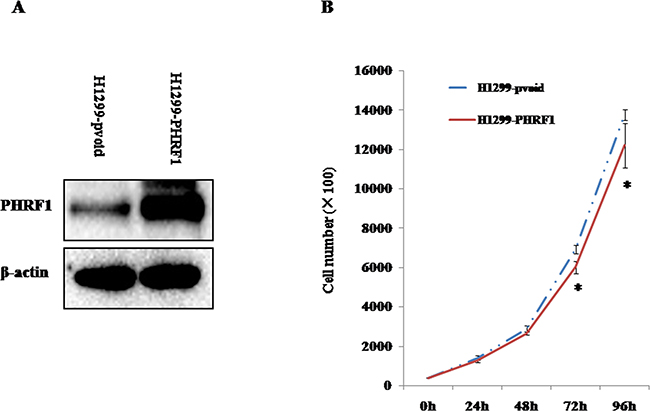 Figure 3: The effects of overexpression of PHRF1 on H1299 cell proliferation. A. Western blot analysis showed that a stable PHRF1-overexpressed H1299 cell line was established. B. Overexpression of PHRF1 inhibited H1299 cell proliferation from 72h. *P<0.05