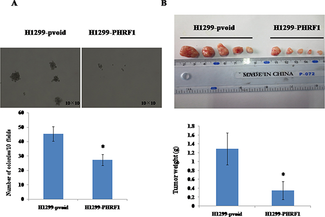 Figure 4: The effects of overexpression of PHRF1 on colony formation and tumor growth in mouse xenograft model. The dramatically decreased colony formation was observed in H1299-PHRF1 cells as compared to H1299-pvoid cells A. There was a significant reduction in the mean of tumor weight in H1299-PHRF1 cells as compared to H1299-pvoid cells B. *P<0.05