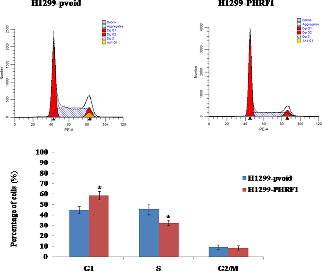 Figure 5: The effects of overexpression of PHRF1 on the distribution of cell cycle. Flow cytometry analysis showed that overexpression of PHRF1 increased the cell percentage in G1 phase and decreased the cell percentage in S phase. *P<0.05