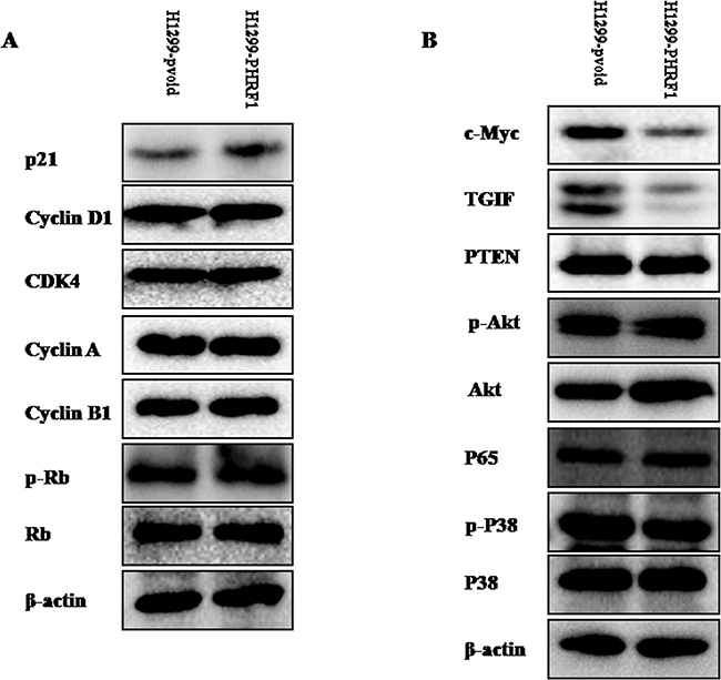 Figure 6: The effects of overexpression of PHRF1 on the expression of interested proteins. Western blot analysis showed that overexpression of PHRF1 could increase the expression of p21 protein A. and decrease the expression of c-Myc and TGIF proteins B.