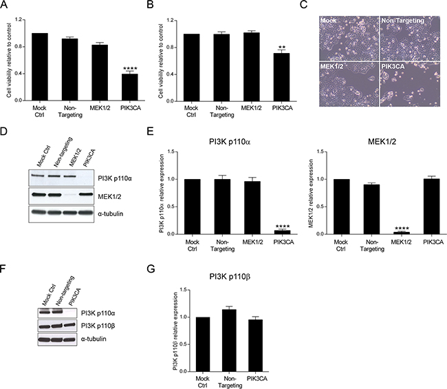 Figure 1: Inhibition of PI3K p110α decreases viability in HCT116 and SW480 CRC cells. The effect of siRNA-mediated targeted depletion of MEK1/2 and PIK3CA on cellular viability was evaluated in HCT116 A. and SW480 B. CRC cells. Briefly, cells were grown, transfected with siRNA for MEK1 and MEK2 or PIK3CA and cellular viability determined by MTS assay 72h after transfection. Representative effects of MEK1/2 or PI3K p110α downregulation on HCT116 cells are shown (C, original magnification: x100). Representative Western blot D, F. and corresponding quantification analysis E, G. of MEK1/2, PI3K p110α (D, E) and PI3K p110β (F, G) upon silencing of MEK1 and MEK2 or PIK3CA in HCT116 CRC cells. Briefly, cells were grown, transfected with siRNA for MEK1 and MEK2 or PIK3CA and protein extracted 72h after transfection. Protein levels were assessed by Western blot analysis and subsequent quantification was performed. Controls included cells transfected with transfection reagent (mock ctrl) and Non-targeting siRNA. Data represent means ± SEM of at least triplicate experiments normalized to controls. All conditions were compared with Non-targeting siRNA. Ctrl, control. **, p< 0.01;****, p< 0.0001.