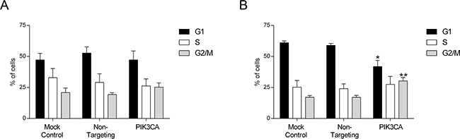 Figure 3: Inhibition of PI3K p110α induces cell cycle arrest in SW480 CRC cells. The effect of siRNA-mediated targeted depletion of PIK3CA on cell cycle was evaluated by propidium iodide (PI) in HCT116 A. and SW480 B. CRC cells. Briefly, cells were grown, transfected with PIK3CA siRNA and PI staining performed 72h after transfection. Subsequent analysis was achieved by flow cytometry. Controls included cells transfected with transfection reagent (mock ctrl) and Non-targeting siRNA. Data represent means ± SEM of at least triplicate experiments. PIK3CA siRNA was compared with Non-targeting siRNA. Ctrl, control. *, p< 0.05; **, p< 0.01.