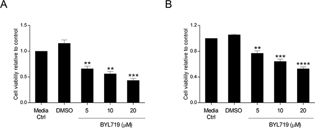 Figure 5: The selective PI3K p110α inhibitor BYL719 decreases viability in HCT116 and SW480 CRC cells. The effect of BYL719 on cellular viability was evaluated in HCT116 A. and SW480 B. CRC cells. Briefly, cells were grown, treated with increasing concentrations of BYL719 (5, 10 and 20 μM) and cellular viability determined by MTS assay 72h after treatments. Controls included cells that remained untreated (media ctrl) and vehicle-treated controls (DMSO). Data represent means ± SEM of at least triplicate experiments normalized to controls. All conditions were compared with DMSO. Ctrl, control; DMSO, dimethyl sulfoxide. **, p< 0.01; ***, p< 0.001; ****, p< 0.0001.