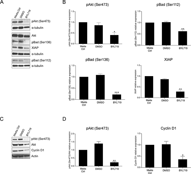 Figure 6: The selective PI3K p110α inhibitor BYL719 induces downregulation of apoptotic- and cell cycle-related proteins in HCT116 and SW480 CRC cells, respectively. Representative Western blot A, C. and corresponding quantification analysis B, D. of PI3K-, apoptosis- and cell cycle-related proteins upon BYL719 treatment in HCT116 (A, B) and SW480 (C, D) CRC cells. Briefly, cells were grown, treated with 20 μM BYL719 and protein extracted 72h after treatments. Controls included cells that remained untreated (media ctrl) and vehicle-treated controls (DMSO). Protein levels were assessed by Western blot analysis and subsequent quantification was performed. Data represent means ± SEM of at least triplicate experiments normalized to controls. BYL719 treatment was compared with DMSO. Ctrl, control; DMSO, dimethyl sulfoxide. *, p< 0.05; **, p< 0.01; ***, p< 0.001.