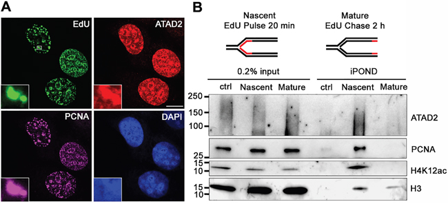 To test this hypothesis we first asked whether in cancer cell lines ATAD2 expression was also cell cycle-dependent as seen in clinical tumor samples (Figures 1A and 1B, Supplementary Figure S1A and B). In MCF7 cells ATAD2 was only detectable at S phase, as indicated by incorporation of the nucleotide analogue EdU (5-ethynyl-2'-deoxyuridine) during DNA replication in those cells. ATAD2 expression was significantly lower or absent at G1 and M phases (Figure 1C). We also confirmed the S phase-specific expression of ATAD2 by flow cytometry using three independent antibodies (Supplementary Figure S2B). We next asked whether ATAD2 is associated with DNA replication sites. ATAD2 colocalized with newly incorporated DNA (EdU) and the essential DNA replication protein PCNA (Figure 2A) at replication foci in MCF7 cells and in several other breast cancer cell lines (T47D, BT-549 and MDA-MB-231; Supplementary Figure S2A) independent of their hormone dependency. This observation was further confirmed biochemically using the iPOND technology (Isolation of Proteins On Nascent DNA [20]) (Figure 2B). Proteins bound on nascent chromatin were isolated by capturing newly synthesized DNA (incorporated EdU for 20 min at 37 °C) and analyzed by Western blot. To compare the proteins on nascent and mature chromatin, samples of mature chromatin were collected from cells chased for 2 hours after a 20 min pulse to allow for the post-replicative maturation of chromatin. ATAD2 was clearly detected on nascent chromatin together with PCNA and newly deposited histone H4 proteins reported to be acetylated at K12. However, ATAD2 was no longer detected on post-replicative chromatin, suggesting a function of ATAD2 at DNA replication sites.