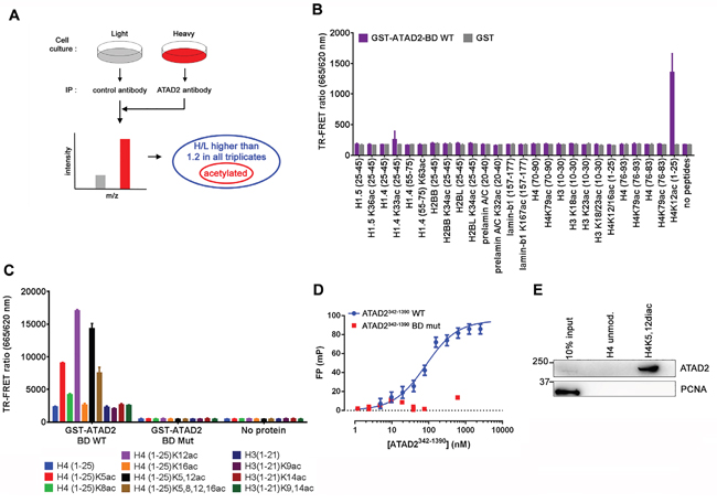 Figure 5: ATAD2 interacts with Histone 4 acetylated at K5 and K12. A. Outline of SILAC experiment to identify ATAD2 interacting proteins through acetylation modification. Immunoprecipitation was carried out using control antibody and antibody against ATAD2 on MCF7 cells grown in light (L) and heavy (H; K8, R10) medium, respectively and bound proteins were analyzed by mass spectrometry. Unmodified as well as acetylated peptides were identified. Only the ones with log10 of the SILAC ratio H/L higher than 1.2 in all triplicates were considered as hits (Figure S4). B. Among the hits H4 (1-25) peptides with acetylation at K12 showed a strong interaction with BD of ATAD2. 1 μM of Biotin-labelled peptides with acetylation identified in the SILAC experiment (A and S4) were incubated with 10 nM of GST-ATAD2 BD (GST-ATAD2-BD WT) or GST as a control and the interaction was monitored by TR-FRET technology. C. H4 (1-25) peptides acetylated at K5, K12, K5,12 or K5,8,12,16 interact with WT BD (GST-ATAD2-BD WT) but not with mutant BD (GST-ATAD2-BD Mut) in the same TR-FRET assay. D. An FP titration of ATAD2342-1390 WT (blue) or BD mutant protein (red) at the concentrations indicated on 8 nM H4K12ac-TAMRA peptide yielded binding saturation curves which in the case of the WT protein could be fitted (solid line) to a one site specific binding model resulting in a KD value of 85 ± 15 nM. E. Endogenous ATAD2 interacts with H4K5,12diac (1-25) but not with unmodified H4 (1-25). Immobilized histone peptides were incubated with nuclear extract from MCF7 cells and bound proteins were analyzed by Western blotting. See also Figures S5 and S6 and SI S4.
