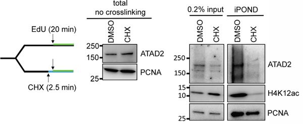 Next we asked whether the interaction of ATAD2 and the new histone marks is indeed required for the recruitment of ATAD2 to replication sites. To this aim we prevented the deposition of new histones on nascent chromatin by blocking histone synthesis with applying cycloheximide (CHX) for 2.5 min after which we analyzed the proteins on nascent chromatin by iPOND (Figure 6 left). In CHX-treated samples the newly synthesized histone H4 acetylated at K12 was lost from nascent chromatin, as previously shown [22]. Similarly, ATAD2 was also lost from the nascent chromatin (Figure 6 right), although the total level of ATAD2 was unaffected (Figure 6 middle). This result strongly supports that ATAD2 is recruited to the replication sites through its interaction with newly synthesized histone that involves the bromodomain of ATAD2 and di-acetylation of histone H4.