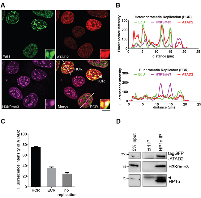 Intrigued by the observation that HP1α was found less on H4K5,12diac peptides in presence of WT ATAD2 in comparison to ATPase mutant (Figure 7A), we hypothesized that ATAD2 might be more relevant for replication of heterochromatin than euchromatin. Supporting this observation we noticed that endogenous ATAD2 (Figure 2A) as well as ectopically expressed ATAD2 (Figure 4A) form speckles in nucleus, similar to that known as pericentric heterochromatin [23]. This observation was more directly assessed by immunofluorescence experiments using antibodies raised against heterochromatin mark, tri-methylation at K9 on histone H3 (H3K9me3). Clearly ATAD2 was found at heterochromatin replication (HCR) foci marked by EdU and H3K9me3 but not at euchromatin replication (ECR) foci (Figure 8A), also confirmed by line scan analysis (Figure 8B). In line with this observation we also found that ATAD2 expression levels were higher in cells undergoing HCR than ECR or non-replicating cells (Figure 8C). In order to further support our findings we employed immunoprecipitation experiments which allow us to directly address whether ATAD2 forms a physical complex with heterochromatin. ATAD2 was co-purified with heterochromatin (Figure 8D) containing HP1α and H3K9me3. Taken together, our data revealed that ATAD2 is associated with heterochromatin replication foci by a physical interaction, perhaps to assist heterochromatin reassembly during replication.