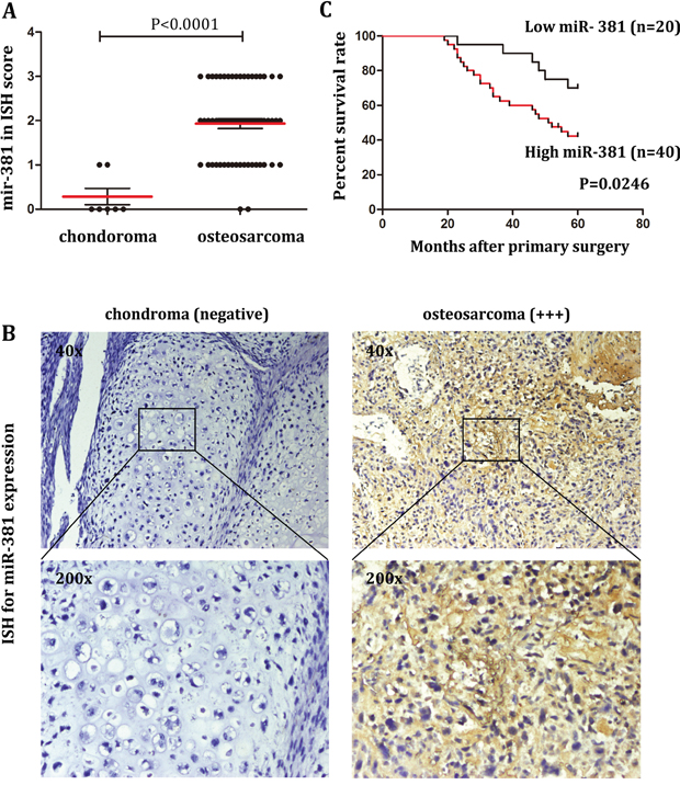 Figure 1: Upregulation of miR-381 in OS tissues is associated with poor prognosis A. ISH scores of miR-381 from 60 samples of 60 OS patients compared to 7 samples from 7 chondroma patients, as described in Materials and Methods. The data showed the miR-381 relatively high expression in OS. B. miR-381 expression in human chondroma and osteosarcoma determined by ISH. Images were obtained using 40x and 200x magnification. C. Kaplan-Meier analysis for overall survival in 60 OS patients in high- and low-risk groups based on miR-381 expression levels.