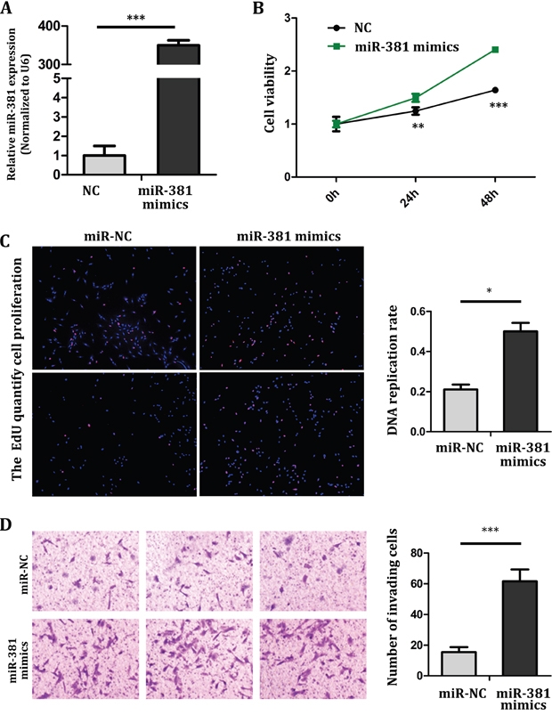Figure 2: miR-381 overexpression promotes MG-63 cell proliferation and invasion A. RT–qPCR analysis of miR-381 expression in MG-63 was performed and normalized against an endogenous control (U6 RNA). B. CCK8 assay showed the increased proliferation of MG-63 cell by transfecting with miR-381 mimics. C. left: MiR-381 promoted the cellular DNA replication in MG-63. Images were obtained under a fluorescent microscope (magnification×40). The red fluorescence was diploid cells. Right: manual count the number of cellular DNA replication in MG-63, calculate the ratio. D. Transwell/Matrigel invasion assay showing overexpressed of miR-381 induced a marked increase in MG-63 cell invasion. * p <0.05; ** p <0.01; *** p <0.001.