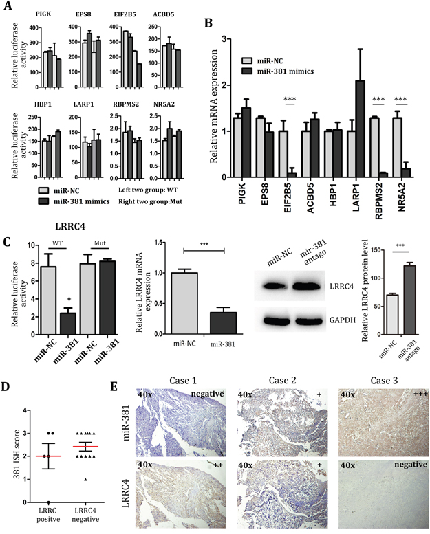 As it was mentioned before, the biological function and target genes of miR-381 largely remains unknown. Here we predicted the PIGK, EPS8, EIF2B, ACBD5, HBP1, LARP1, RBPMS2, NR5A2 and LRRC4 to be the candidate target genes of miR-381 by using the miRanda, TargetScan and StarBase software. Luciferase assay and real-time PCR detection indicated that PIGK, EPS8, EIF2B, ACBD5, HBP1, LARP1, RBPMS2 and NR5A2 were not the direct target genes of miR-381(Figure 3A). Although real-time PCR suggested that EIF2B5, RBPMS2 and NR5A2 expression were suppressed by miR-381 in MG-63 cells, there was no statistical difference in its ability to modify all aspects of luciferase activity. So even miR-381could indirectly decrease the expression of RBPMS2 and NR5A2, it was unable to directly target the 3’-UTR of RBPMS2 and NR5A2. (Figure 3A, 3B). LRRC4 hence became the best candidate for direct target gene of miR-381 in MG-63 cells (Figure 3C).