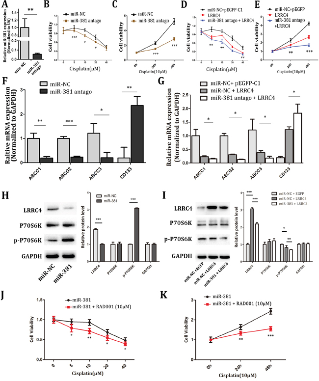 Figure 5: miR-381 antago increased the chemotherapy sensitivity of MG-63 cells by targeting LRRC4 transit mTOR pathway. A. The real-time PCR showing the mRNA level of genes after transfected miR-381 antago. B. MG-63 cell transfected with NC or miR-381 antago were treated with various concentrations of cisplatin for 48 h and then subjected to CCK8 assays. C. MG-63 cell were transfected with miR-381 antago treated in cisplatin (10μM), then we tested the cellular activity in increasing time. D, E. CCK8 assays showed in MG-63, overexpressed LRRC4 improvement sensitivity to cisplatin. Inhibition of miR-381 could amplified LRRC4 sensibilization. F. The real-time PCR analyze expression of some multidrug resistance genes and D133 after transfected miR-381 antago in MG-63. G. LRRC4 suppressed the expression of these multidrug resistance genes and increased CD133. H, I. Western blot analysis the LRRC4, p-p70S6K and p70S6K expression. J. MG-63 cell after transfected miR-381 then incubated with RAD001 (10nM) for 24h, treated with diverse concentrations of cisplatin and detected cell activity 48h later. K. MG-63 cell after transfected miR-381 then incubated with RAD001 (10nM) for 24h, incubated with cisplatin (10μM) and detected the cellular activity in increasing time by using CCK8. * p <0.05; ** p <0.01; *** p <0.001.