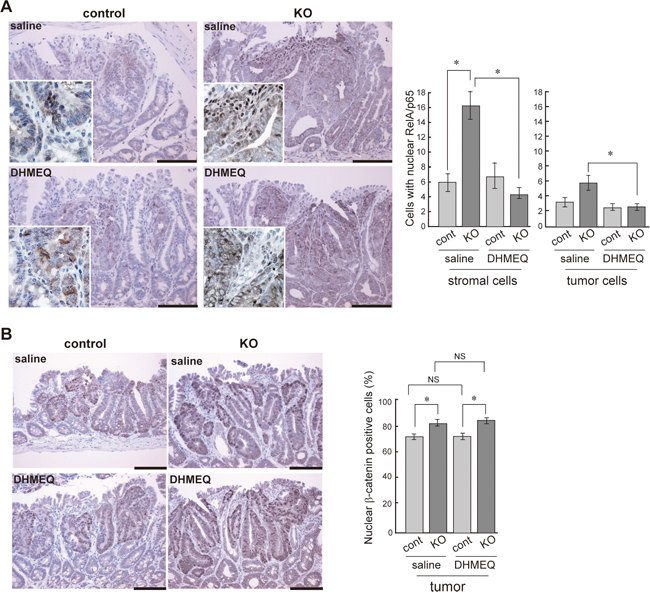 Figure 3: Effect of DHMEQ on nuclear translocation of RelA/p65 and β-catenin in HAI-1-deficient ApcMin/+ mice tumor. Immunostaining of RelA/p65 (A), and β-catenin (B) of control and KO tumor before and after DHMEQ treatment. The enlarged image is also shown as an inset. Bar, 100 μm. *, p < 0.01. NS, not significant.