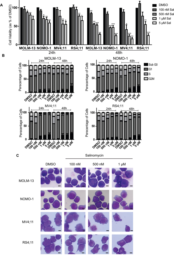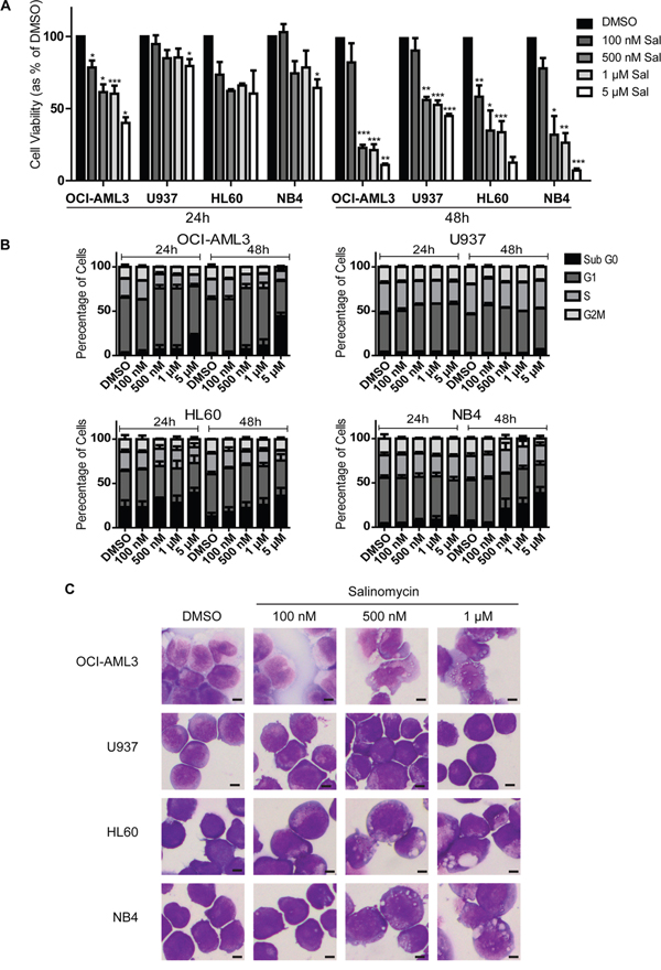 Figure 1: Differential sensitivity of human AML cell lines to salinomycin. A. Bar graphs showing decreased viability in AML cell lines over time following salinomycin treatment at the indicated dosage compared to 0.01% DMSO vehicle control. B. Bar graphs showing altered cell cycle (Propidium Iodide staining) in AML cell lines over time following salinomycin treatment at the indicated dosage or 0.01% DMSO vehicle control. C. Representative morphology images of AML cell lines treated for 48 hours with salinomycin at the indicated dosages or 0.01% DMSO. Mean values ± S.E.M. of biological replicates (n=3) are plotted throughout. ***P < 0.001, **P < 0.01, *P < 0.05, t-test. Scale bar = 4 μm.