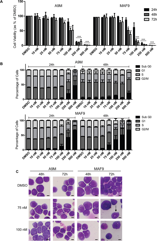 Figure 3: Salinomycin-sensitive primary murine AML and MLLr leukemia cell lines. A. Bar graphs showing decreased viability in A9M and MAF9 primary leukemia cell lines over time following salinomycin treatment at the indicated dosage compared to 0.01% DMSO vehicle control. B. Bar graphs showing altered cell cycle (Propidium Iodide staining) in A9M and MAF9 primary leukaemia cell lines over time following salinomycin treatment at the indicated dosage or 0.01% DMSO vehicle control. C. Representative morphology images of A9M and MAF9 primary leukaemia cell lines treated for 48 and 72 hours with salinomycin at the indicated dosages or 0.01% DMSO. Band neutrophil is highlighted with an arrow. Mean values ± S.E.M. of biological replicates (n=4) are plotted throughout. ***P < 0.001, **P < 0.01, *P < 0.05, t-test. Scale bar = 4 μm.