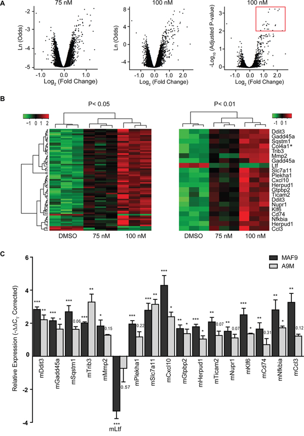 Figure 4: Differential gene expression in treated MAF9 cells. A. Volcano plots of significance for each of 24,326 probes from salinomycin (75 nM and 100 nM) treated MAF9 cells in the form of B-statistic (log-odds) or negative log10 (Adjusted P-value) versus log2 (fold change) compared to 0.01% DMSO. Ultimately only genes with −log10 (Adjusted P-value) > 2 and log2 (fold change) > 0.5 were considered (marked by a red box). B. Hierarchical agglomerative clustered heatmaps of samples and transcripts induced or repressed at log2 (fold change) of 0.5 or more (P ≤ 0.05) (left panel) were sorted in ascending order (n=18 genes) by adjusted P-value to P ≤ 0.01 (right panel). Hierarchical clustering was based on a Euclidean distance and complete linkage as distance and linkage methods. C. Bar graph demonstrating validated expression of 17 of the 18 genes of interest as measured by real-time qRT-PCR. Mean relative expression (-ΔΔCT) values ± S.E.M of biological replicates (n=4) were plotted. ***P < 0.001, **P < 0.01, *P < 0.05, t-test.