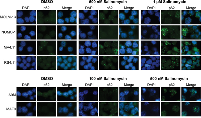 Figure 5: Induction of Sequestosome-1(p62) positive aggresomes/vesicles. Combined immunofluorescence staining of SQSTM1/p62 with Alexa Fluor and DAPI depicting accumulation of cytoplasmic aggresomes/vesicles in MLLr, A9M and MAF9 cells treated with salinomycin for 48 hours at the indicated dosages or 0.01% DMSO. Representative images were taken using an x60 objective.